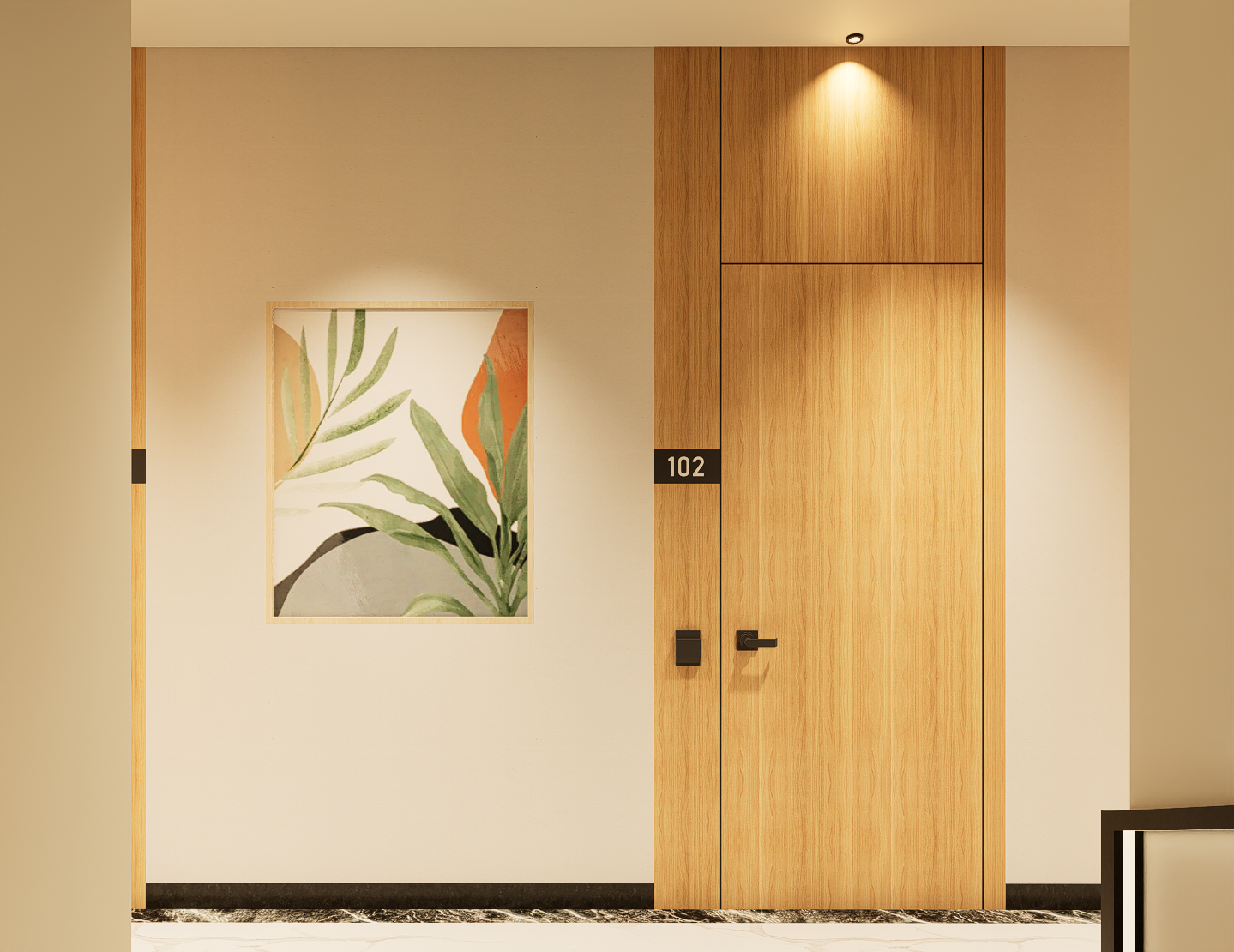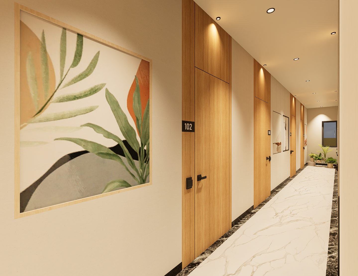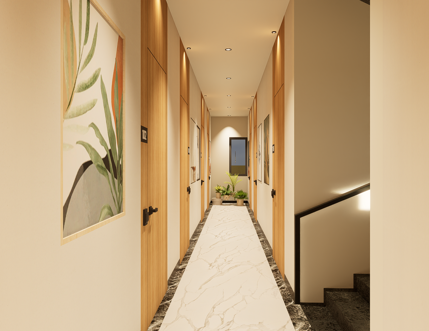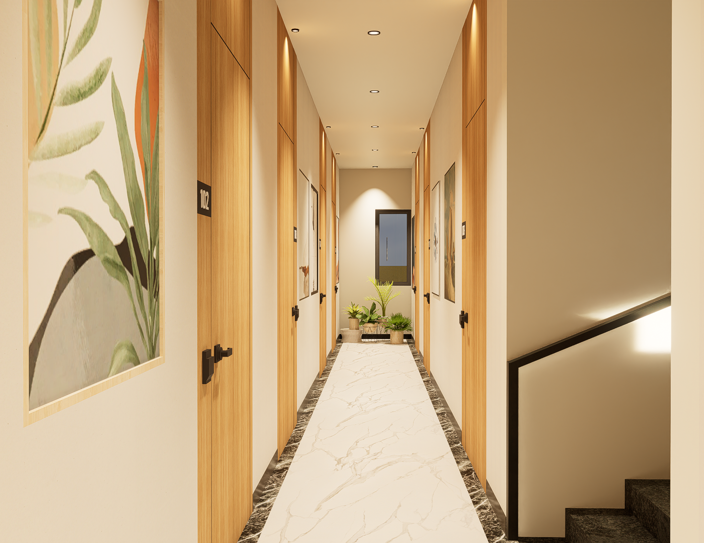 Premium lighting and clean, modern finishes make circulation areas feel bright and inviting.